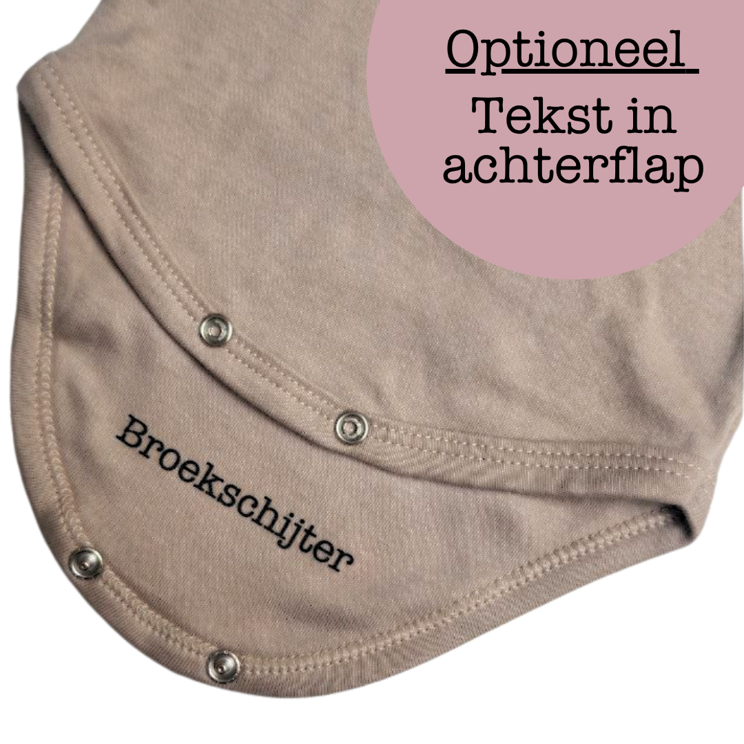 Bij deze body's is het mogelijk om in de achterflap de tekst 'Broekschijter' toe te voegen. Een inside mopje dat je enkel ziet op momenten dat je het het minst verwacht...