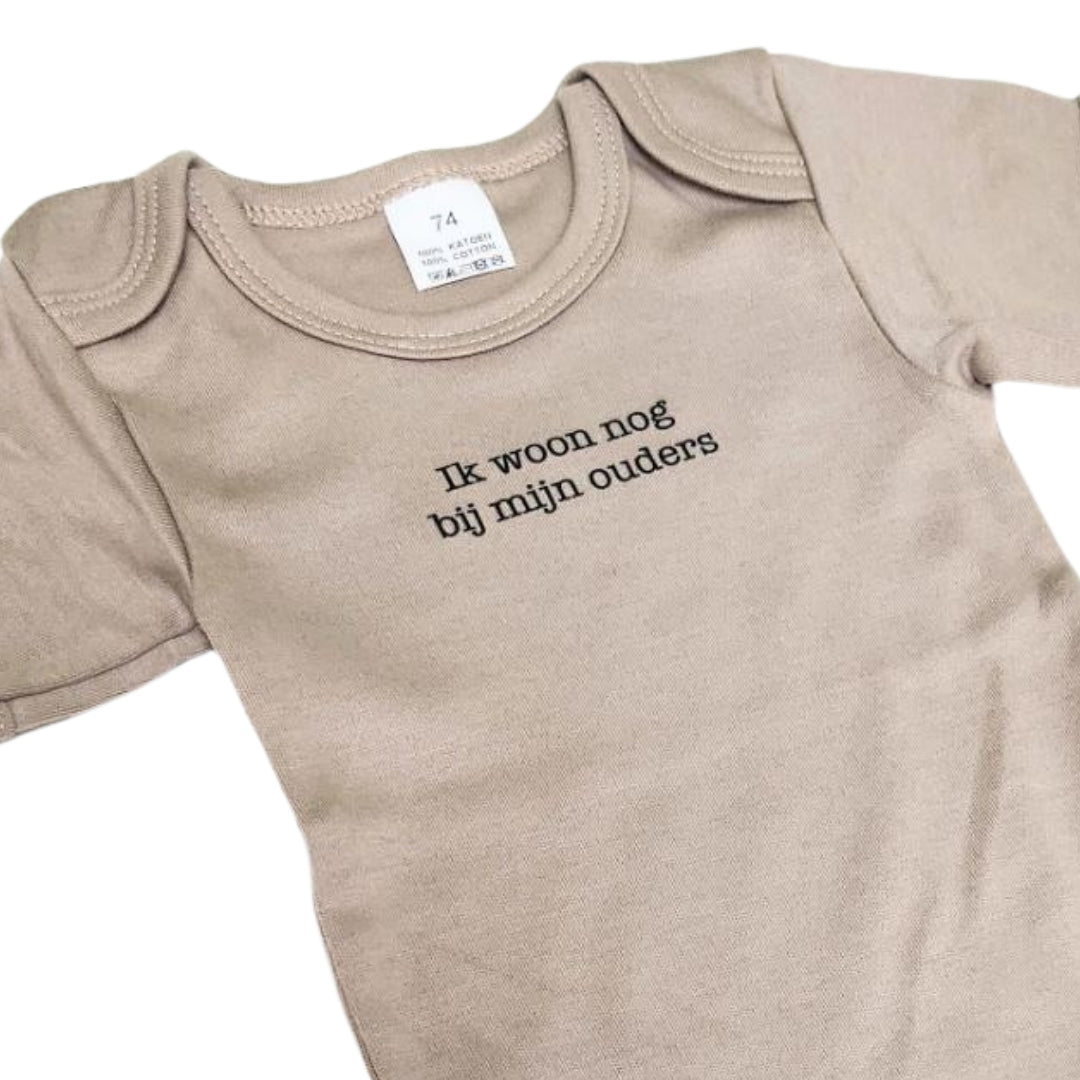 Een body voor baby’s waar ‘Ik woon nog bij mijn ouders’ op gedrukt staat, dat is toch hilarisch?! En we kunnen het de kleine ook niet kwalijk nemen, probeert eens een eigen woonst te vinden in deze huizenmarkt en economie…